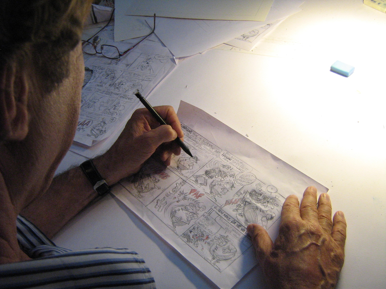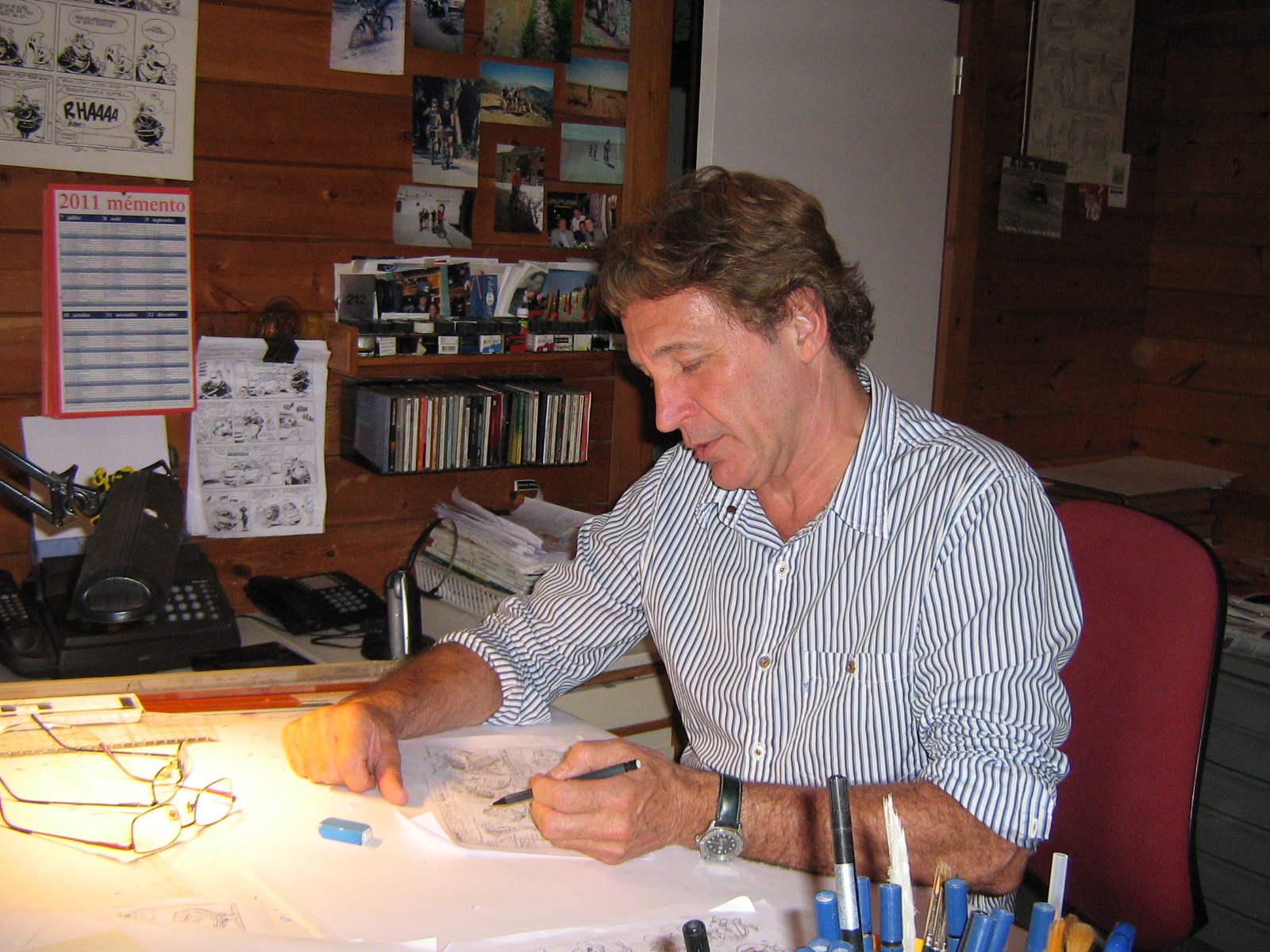 Dans un premier temps, je travaille avec un porte-mine, ensuite, j’utilise la plume, pinceau, feutre pour les encrages. J’aimerais pouvoir changer de style mais quand on fait une série depuis autant d’année on est un peu « bloqué « dans un style. Parfois, j’ai envie de dessiner avec trois traits, je serais plus à l’aise.