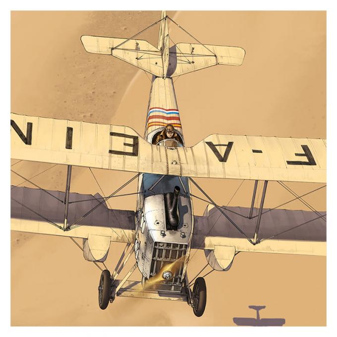 Dans ce livre illustré, Romain Hugault prend autant de soin sur les décors que sur les appareils. On survole désert, villes et océans avec le même soin. L’éditeur a mené un joli travail de fabrication pour pouvoir proposer de nombreuses images panoramiques sur deux A3 en longueur, sublimant le travail du peintre du ciel qu’est Hugault.