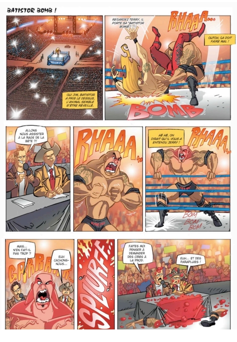 purement inventés, montrent l’opposition entre les jeux de scène à la mécanique bien « huilée » des catcheurs et l’envers du décor, ce qui donne lieu à des situations loufoques, tout en respectant les codes du catch. Les fans y reconnaîtront sans peine leurs stars préférées.